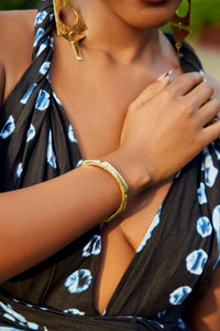 Radiating subtle sophistication and contemporary style, the Mikondo Bracelet is a striking open-ended bangle that blends elegance with strength. "Mikondo," meaning "knot" in Swahili, is captured in its sleek gold-toned design featuring a textured knot detail, handcrafted to shine against the skin. Perfect for transitioning from a casual day to an elegant evening, this piece adds a refined touch to any ensemble.