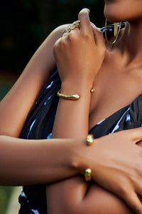 Exuding serene elegance and modern simplicity, the Mukiri Smooth Bracelet is a graceful open-ended bangle that embodies thoughtful design. "Mukiri," meaning "thought" in Swahili, is showcased in its sleek gold-toned finish with smooth, teardrop-shaped ends, handcrafted for a polished look. Perfect for both everyday wear and special moments, this piece adds a refined touch to any style.