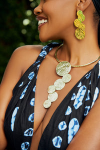 The interplay of polished collar and hammered discs delivers a dynamic look—perfect for those who appreciate bold design and handcrafted detail. Whether you’re dressing for a special occasion or adding flair to your everyday style, the Miduara Necklace stands out as a versatile, eye-catching accessory.
