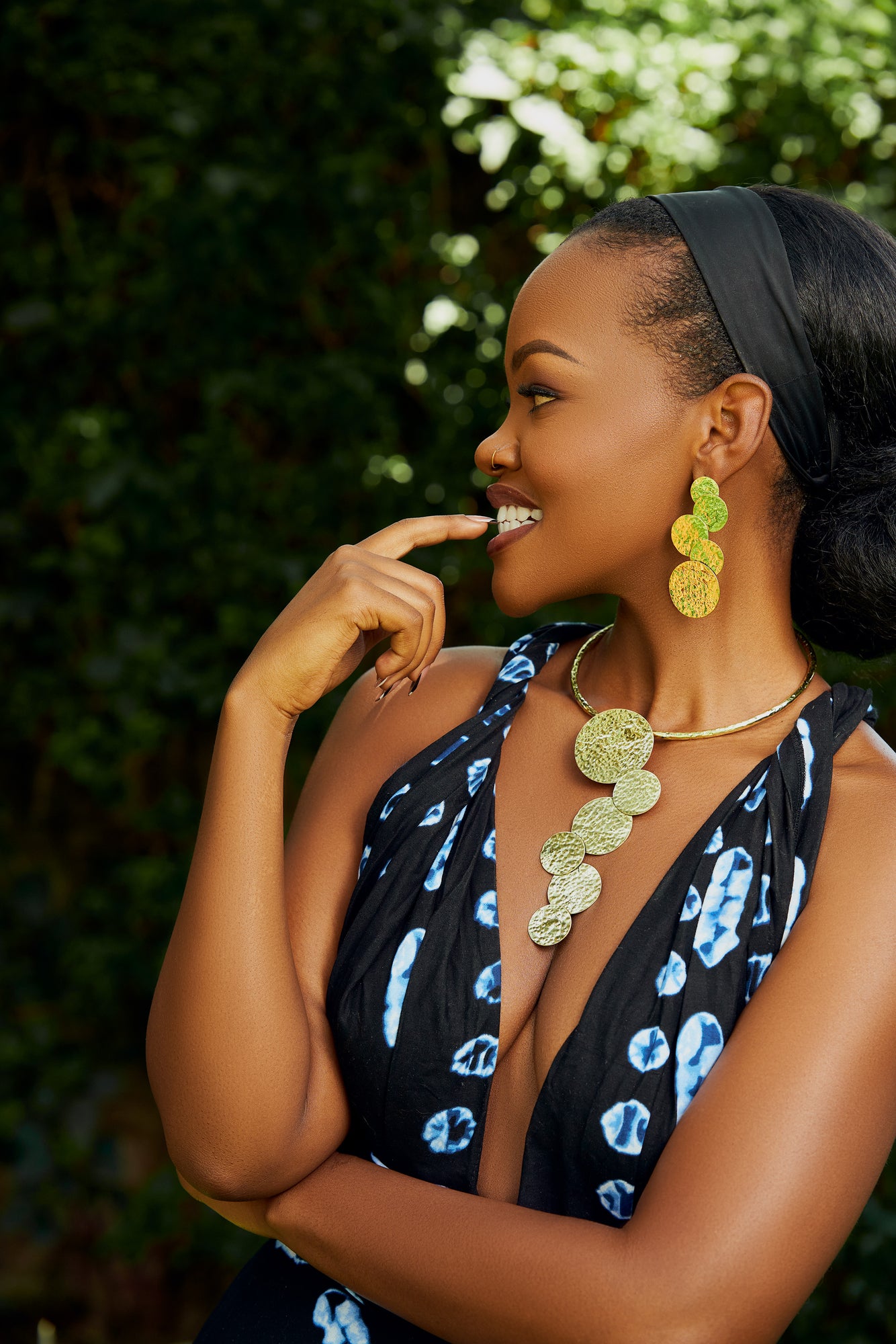 Discover the artistry of the Miduara Necklace, a statement piece that brings modern texture and movement to your jewelry collection. Named after the Swahili word “miduara,” meaning “circles,” this necklace is a celebration of form and flow. The design features a striking cascade of six circular discs, each one descending in size and expertly hammered to create a textured, light-catching surface. The discs are suspended from a smooth, rounded collar that sits comfortably at the neckline, framing the face and adding a contemporary edge to any outfit.